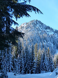 There are several wonderful snowshoe tours in the Stevens Pass area, but this is probably my favorite. We park along the shoulder of noisy, smelly, busy Highway 2 east of the pass, but it doesn't take long to escape into the side valley where a peaceful winter wilderness awaits. The tour partly follows the forest road gently up the valley, but also includes (conditions permitting) some wandering off the beaten path to enjoy a trackless route alongside Smith Brook-- a magical sight under the deep snows. Remember to select a Snowshoe Rental if you need to reserve a set of snowshoes and poles.